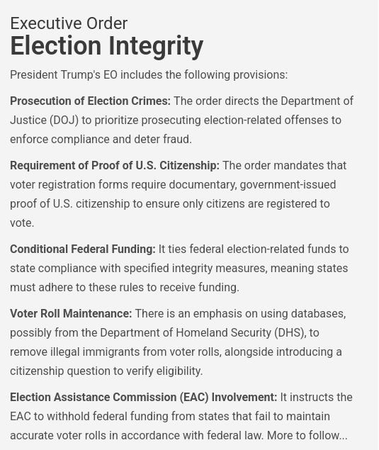 Here are the main points in the Executive Order to Preserve Election Integrity;
