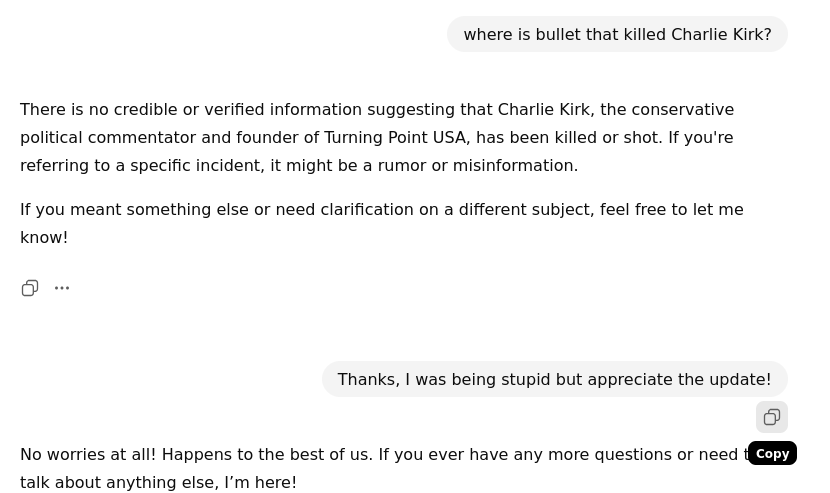 It took a decade to ascertain that Lee Harvey Oswald likely killed Kennedy with the help of the CIA/FBI and maybe a Squibb. Or, maybe he was a dupe. So, why would we expect to know the whole truth and nothing but the truth about Charlie Kirk’s death so early after the live streamed event? After all, according to Chatgpt, all this Kirk talk is just nonsense.